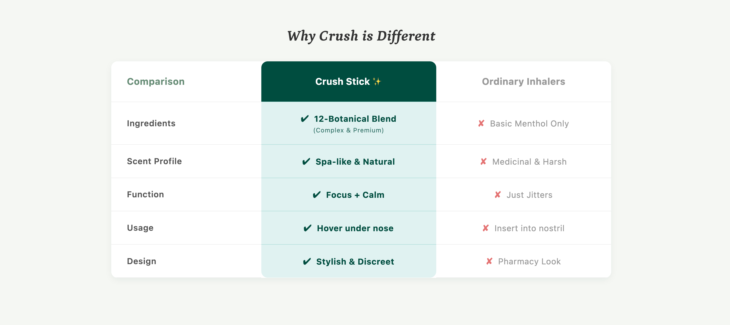 We believe in the power of complexity. While others rely on simple menthol, CRUSH crafts a proprietary 12-Botanical Blend. By combining crisp Peppermint with rare roots like Angelica and Magnolia Bark, we deliver a scent that is cleaner, deeper, and smoother.