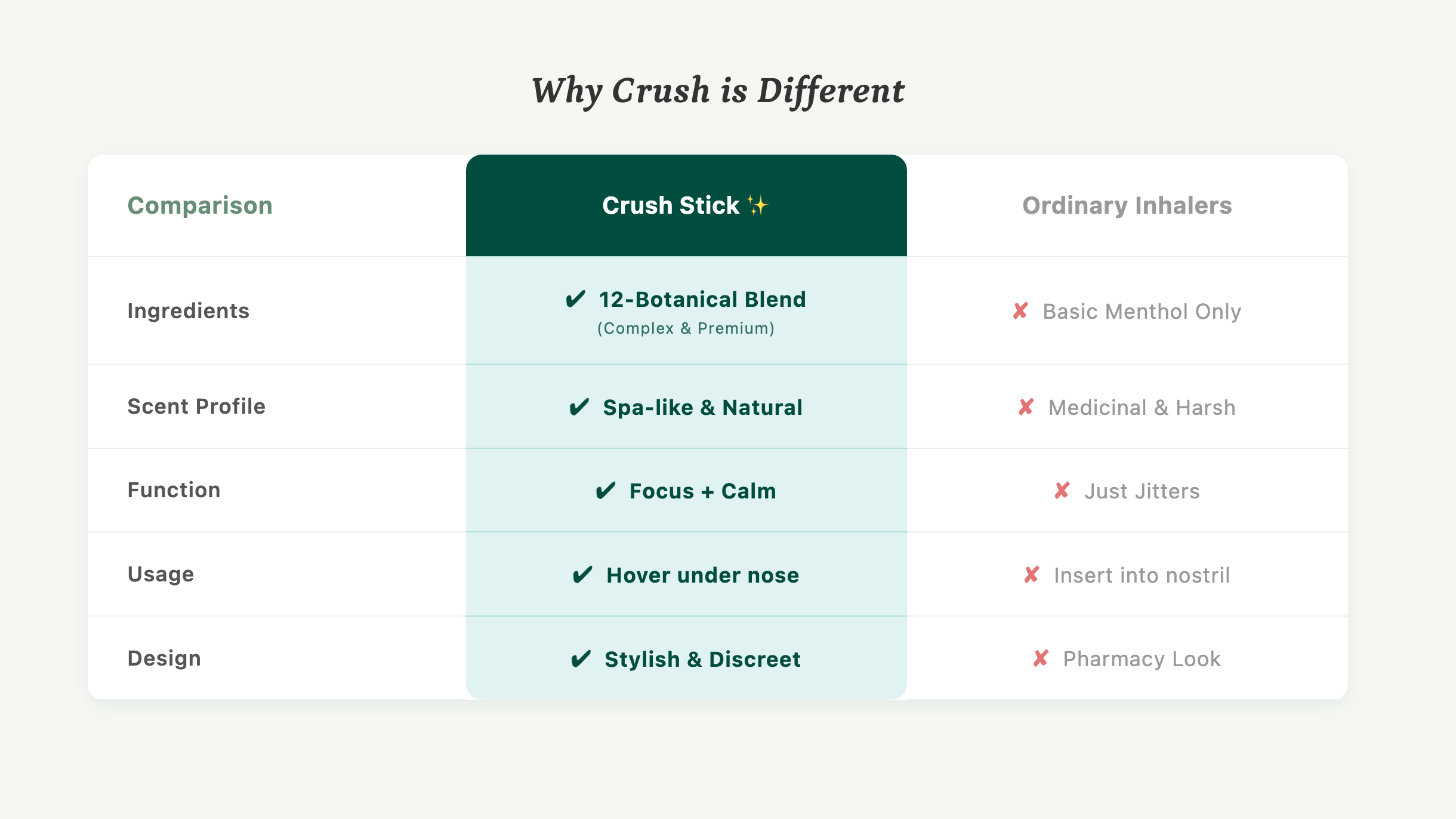 Unlike basic menthol sticks, our signature formula is a complex symphony of 12 premium botanicals. We blend invigorating essential oils with rare herbal extracts—crafted not just to wake you up, but to keep you alert, focused, and emotionally balanced. Anytime, anywhere.